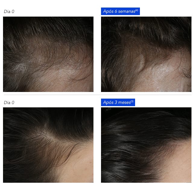 (2)Estudo clínico, 40 mulheres, 3 meses – caso n°12 representativo da média do aumento da densidade. (3)Estudo clínico, 52 mulheres, 3 meses - teste de tração capilar. (4)Estudo clínico, 52 mulheres, 6 semanas - % de satisfação.