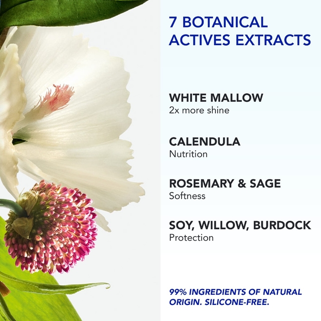 A nossa extração de malva branca proporciona 2 vezes mais brilho e suaviza a fibra capilar.***